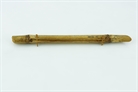 The whistle flute jedinka, a single labial flute, crafted from one block of wood. It is cut in a square shape and there are six finger-holes on the front side. Both the holes and the ornament (which is barely visible) are burned. The instrument is yellow.
