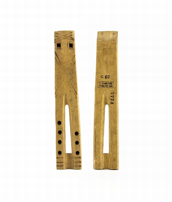 The double flute, a twin-bore labial monoxyle flute, crafted from one block of wood, with holes arranged 4:3. It is ornamented in slanted lines which were carved and burnt - a geometrical ornament.